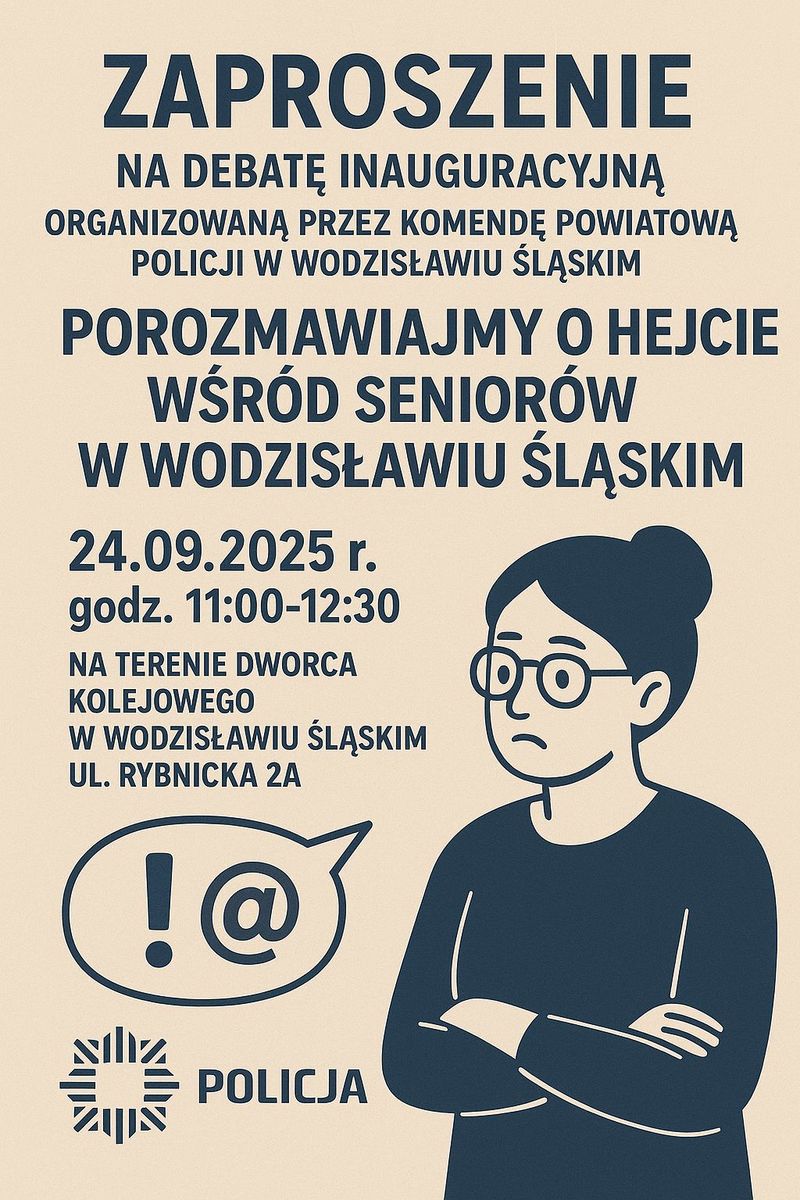 Policjanci zapraszają na inauguracyjną debatę społeczną, która odbędzie się w dniu 24 września br. w godzinach od 11-12.30 na terenie dworca kolejowego w Wodzisławiu Śląskim. Tematem debaty będzie problem hejtu wśród seniorów. Przyjdź, porozmawiaj z nami o bezpieczeństwie seniorów.
